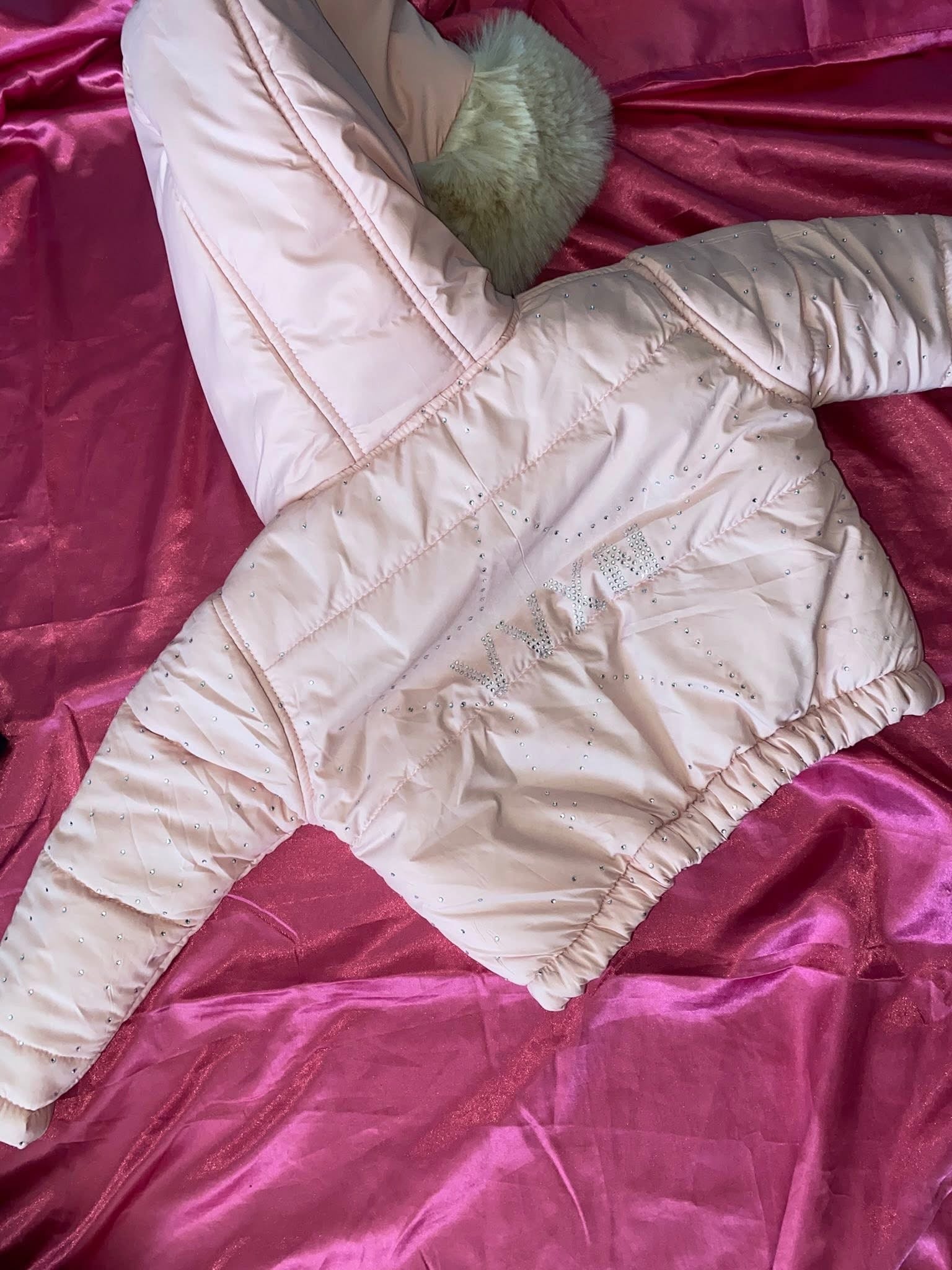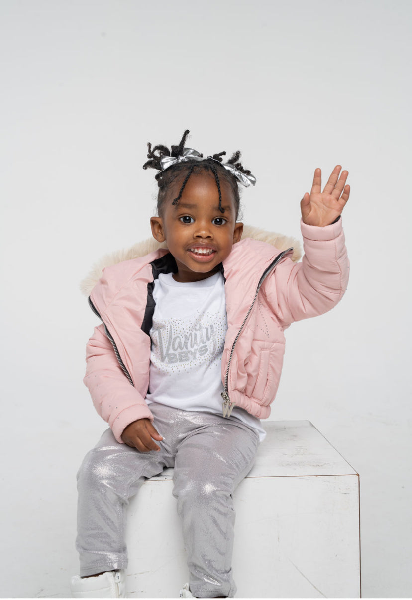 Wrap your little star in luxury. The Little Lumi Bling Coat in blush pink blends cozy comfort with signature Vanity sparkle. Designed in a quilted puffer style, it features crystal-studded star patterns, the VVXN logo in rhinestones, and a plush faux-fur hood for extra warmth and glam.